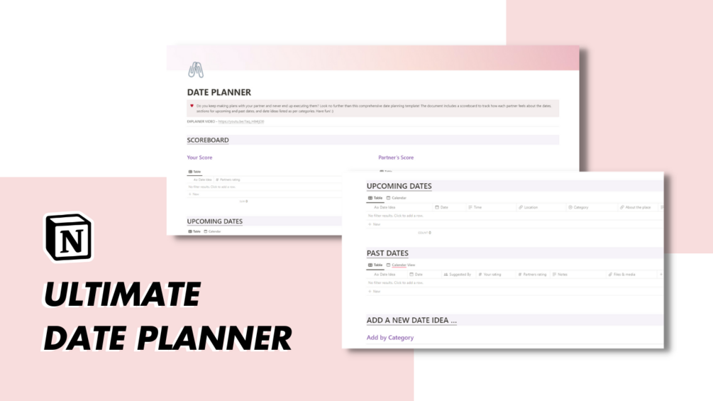 Do you keep making plans with your partner and never end up executing them? Look no further than this comprehensive date planning template! The document includes a scoreboard to track how each partner feels about the dates, sections for upcoming and past dates, and date ideas listed as per categories. Have fun! :)